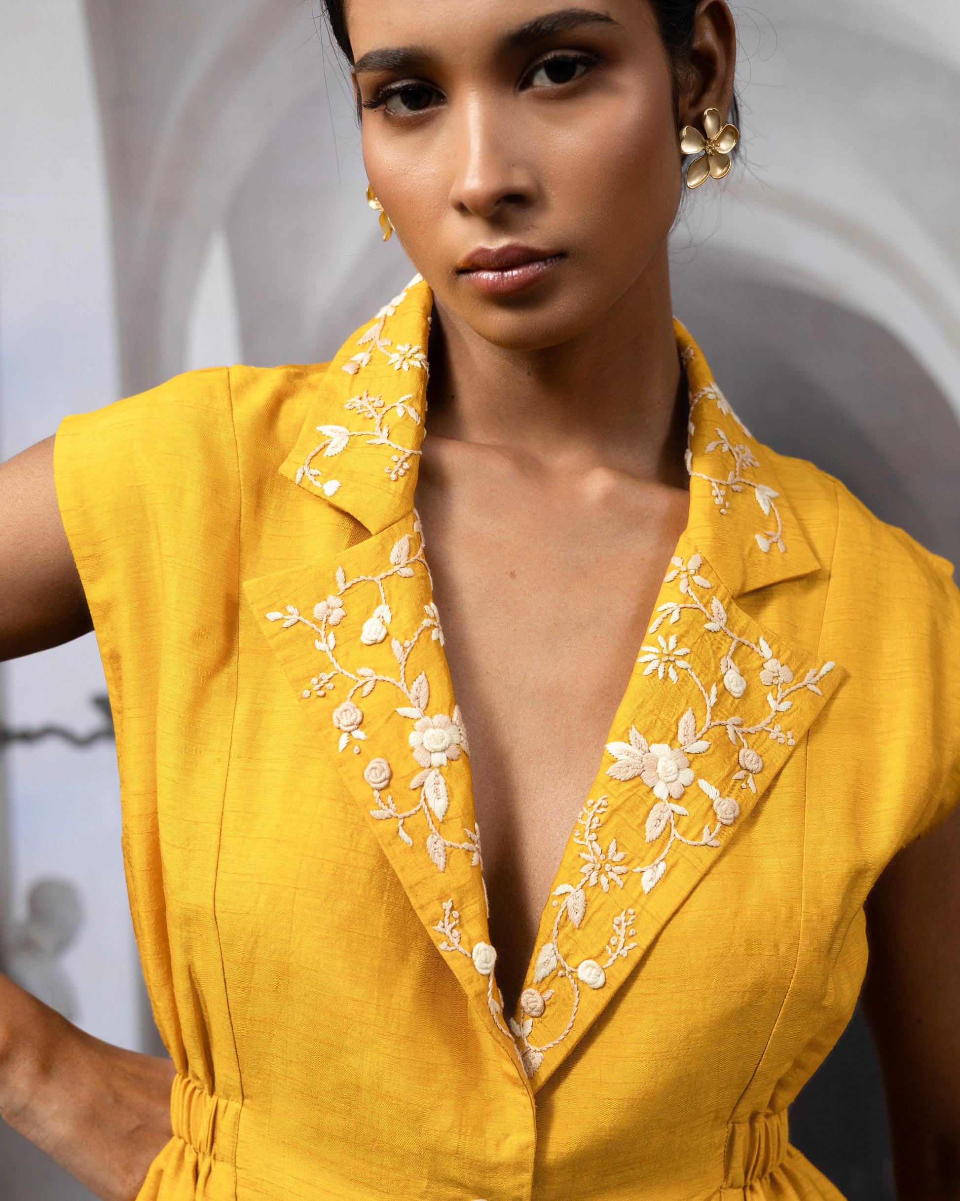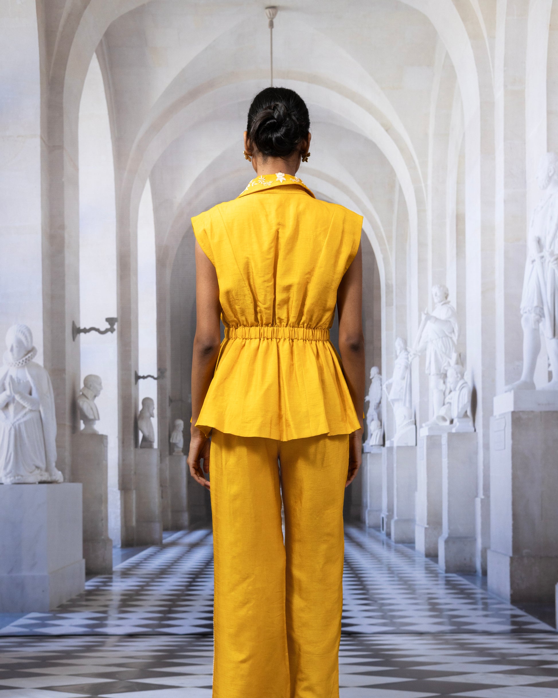 Step into effortless elegance with the Paulina Co-ord Set, crafted in luxurious Bemberg silk — a soft, breathable viscose blend — and fully lined with 100% cotton for all-day comfort. The sleeveless blazer-style top features a structured silhouette with gathered detailing at the waist and an exquisitely hand-embroidered lapel. Delicately executed using a Mixed artisanal technique of Parsi Gara, Herringbone, and Kantha, the embroidery adds a refined charm to this striking piece.