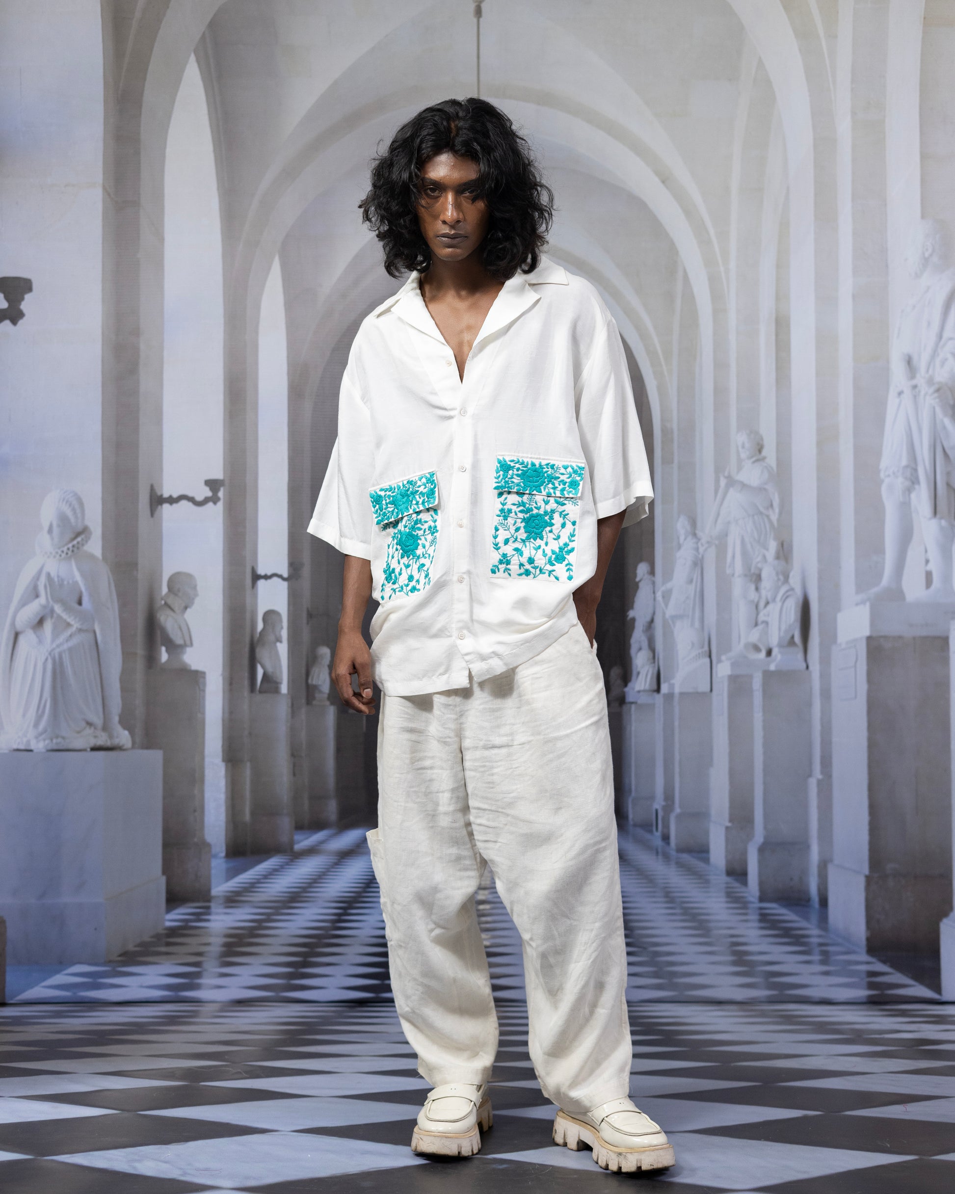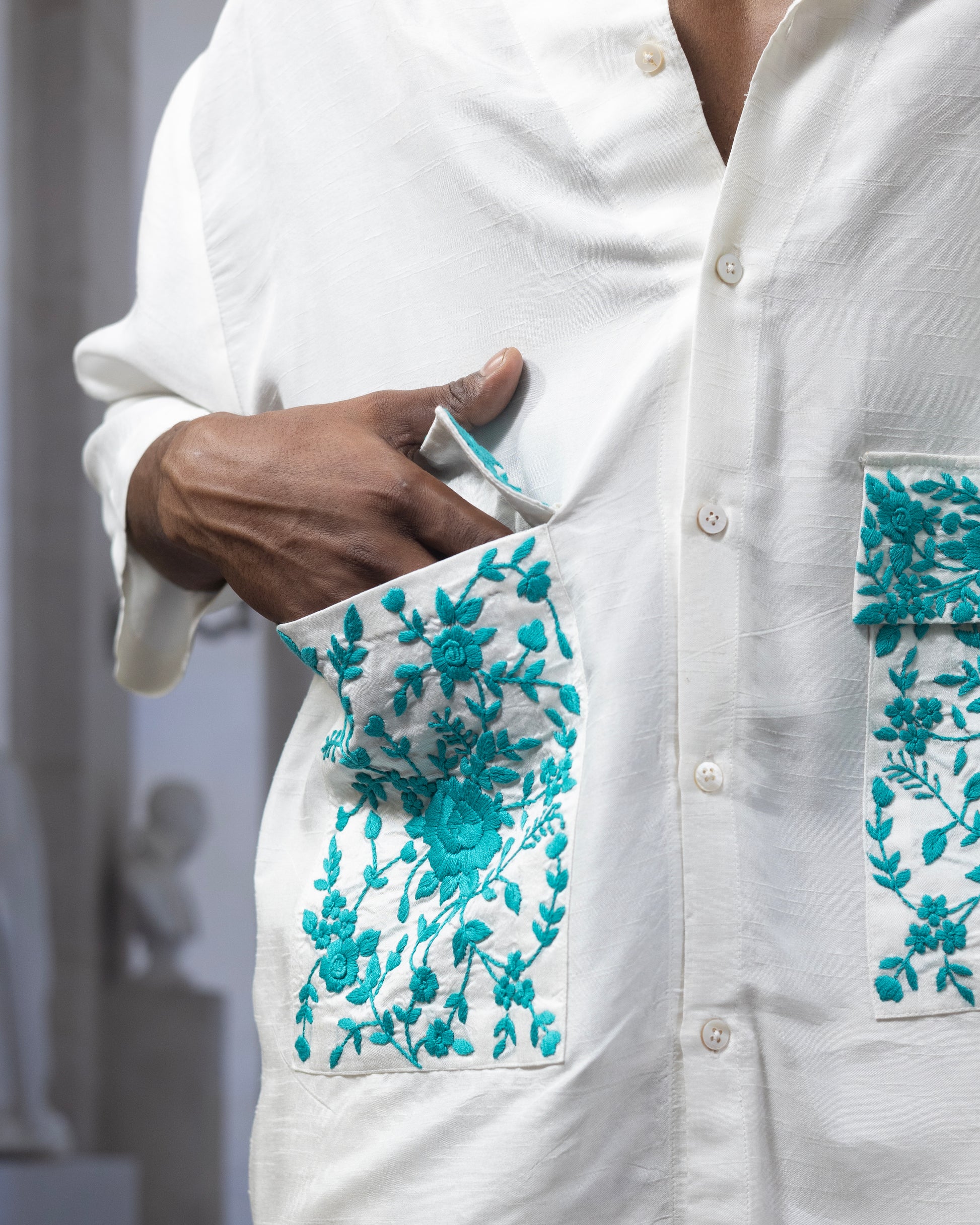 A laid-back silhouette meets heritage craftsmanship in the Peter Resort Shirt. Made from breathable Bemberg silk (viscose blend), this statement piece is elevated with traditional Parsi Gara hand embroidery in striking turquoise tones. Designed for both function and flair, it features oversized double flap pockets that add utility and a bold style element to the relaxed fit.