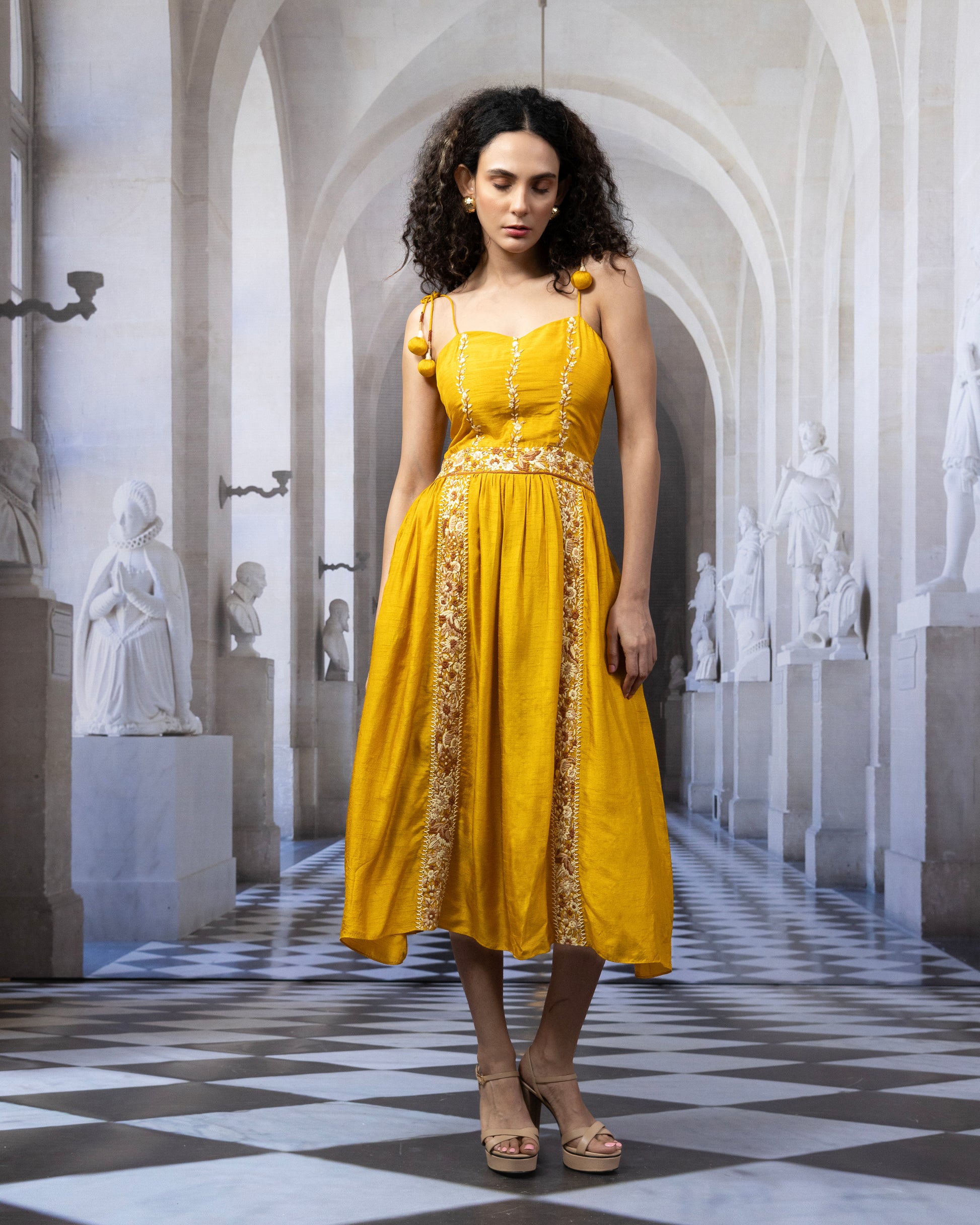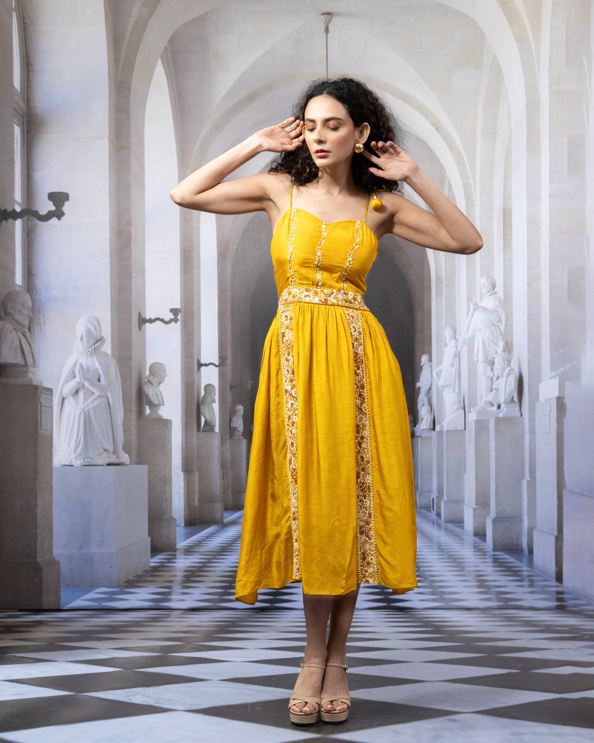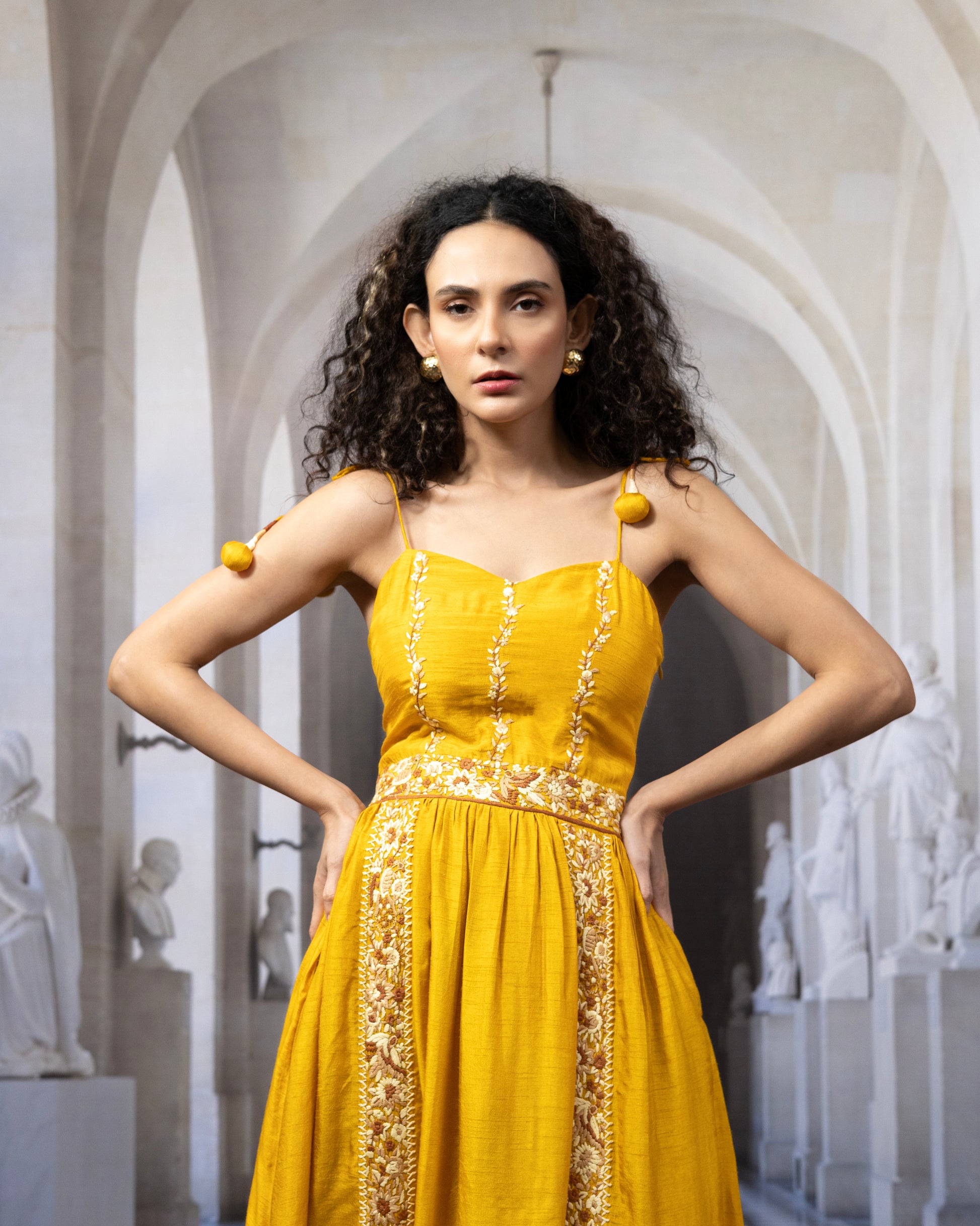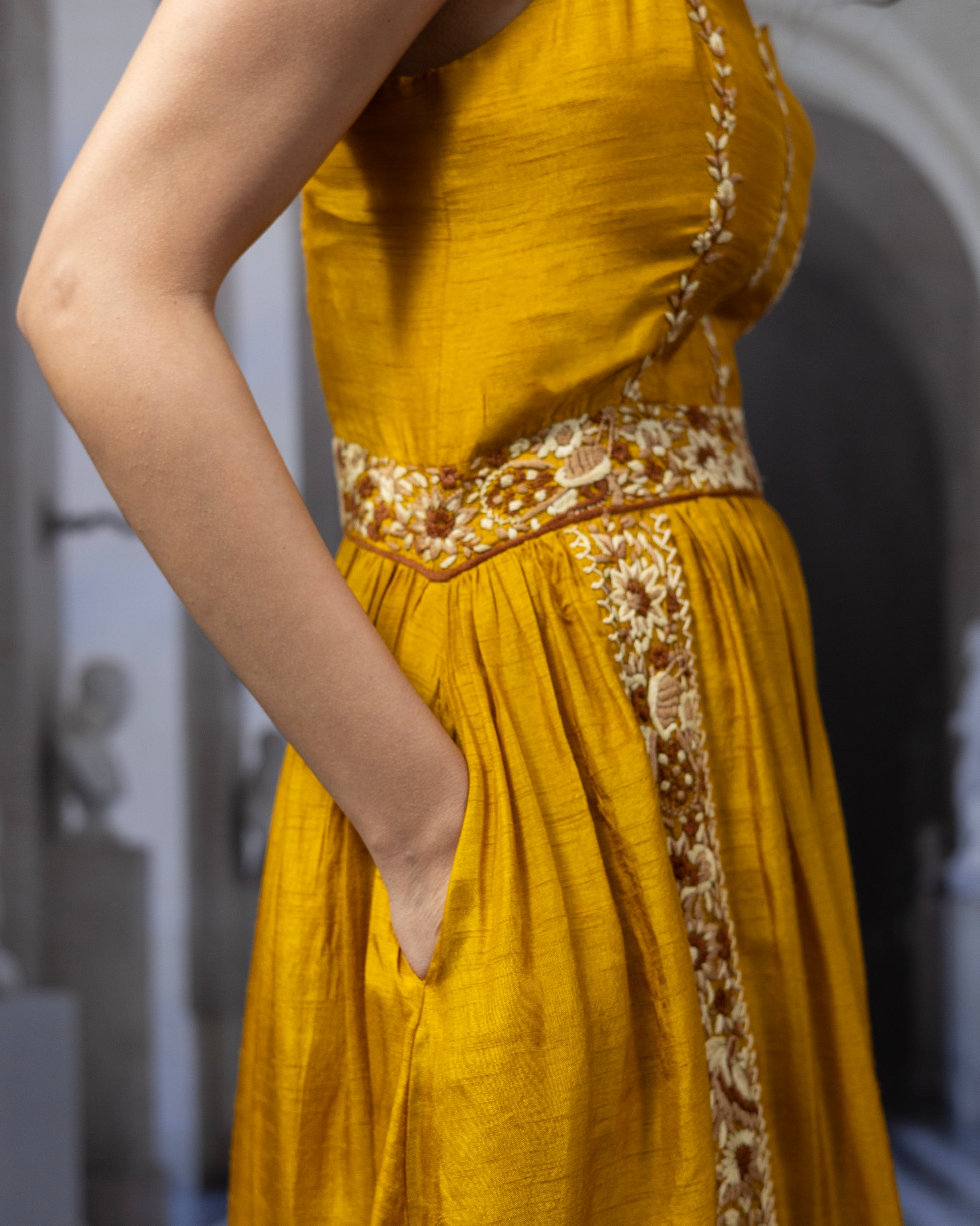 Radiant and refined, the Phoebe Dress is crafted in rich Bemberg silk — a fluid viscose blend that drapes effortlessly. Featuring intricate hand embroidery in Parsi Gara and Herringbone techniques, the dress is designed for ease, elegance, and shape.