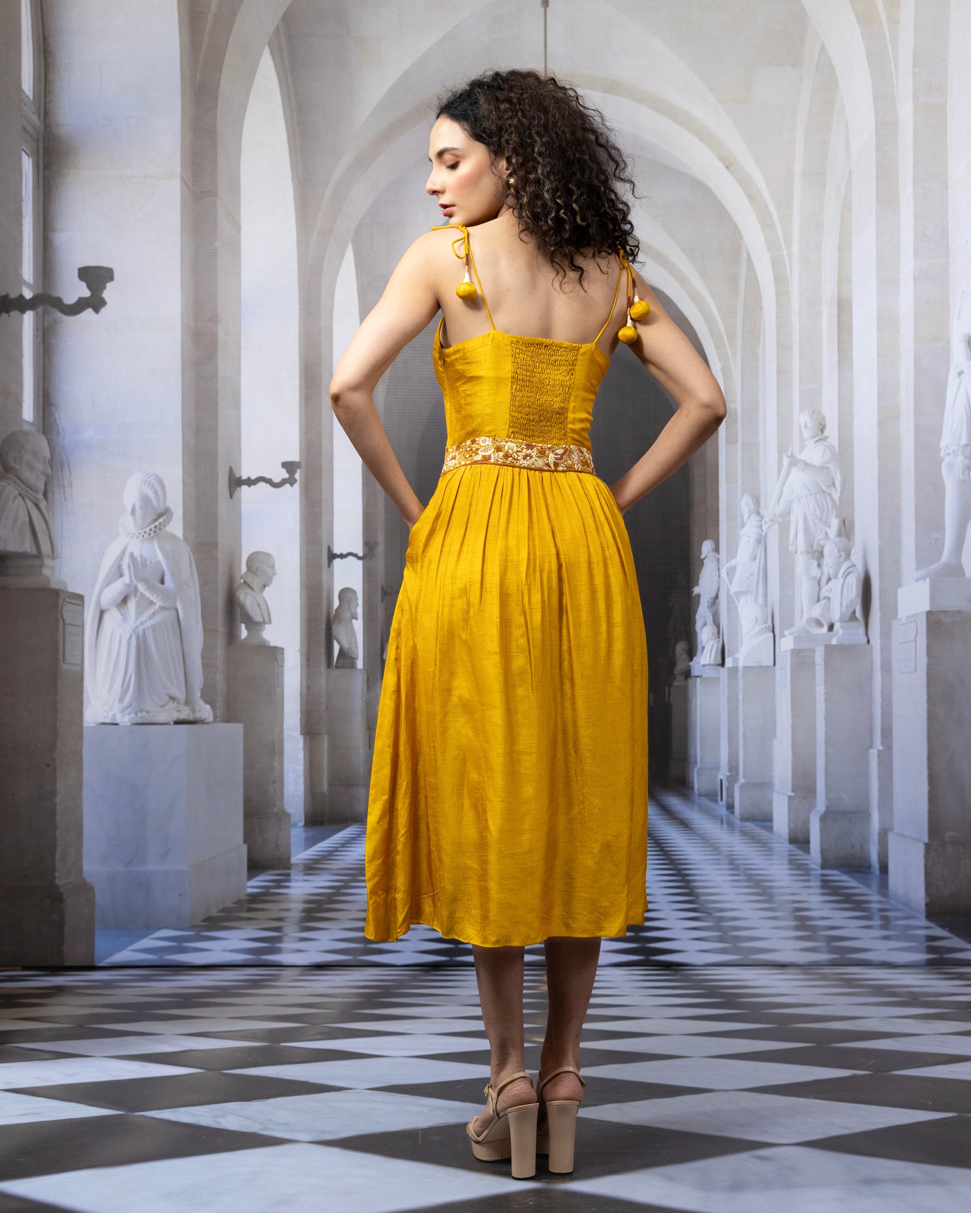 The smocked back offers a body-inclusive fit, while hand-embroidered skirt panels and playful tie-up straps with tassels add standout detail. Finished with discreet side pockets for everyday ease.