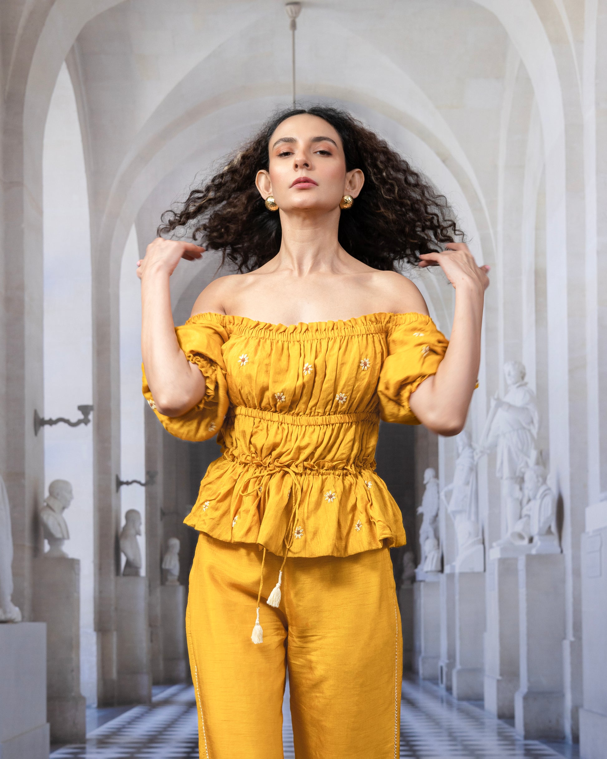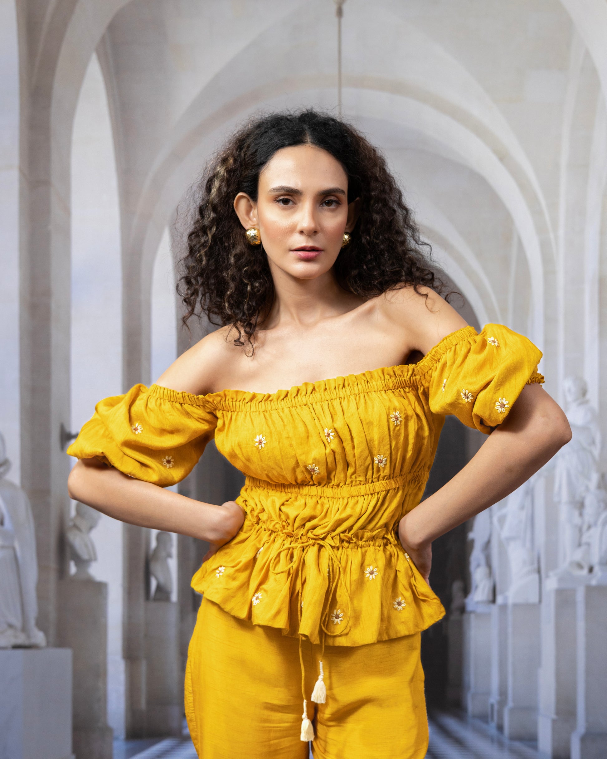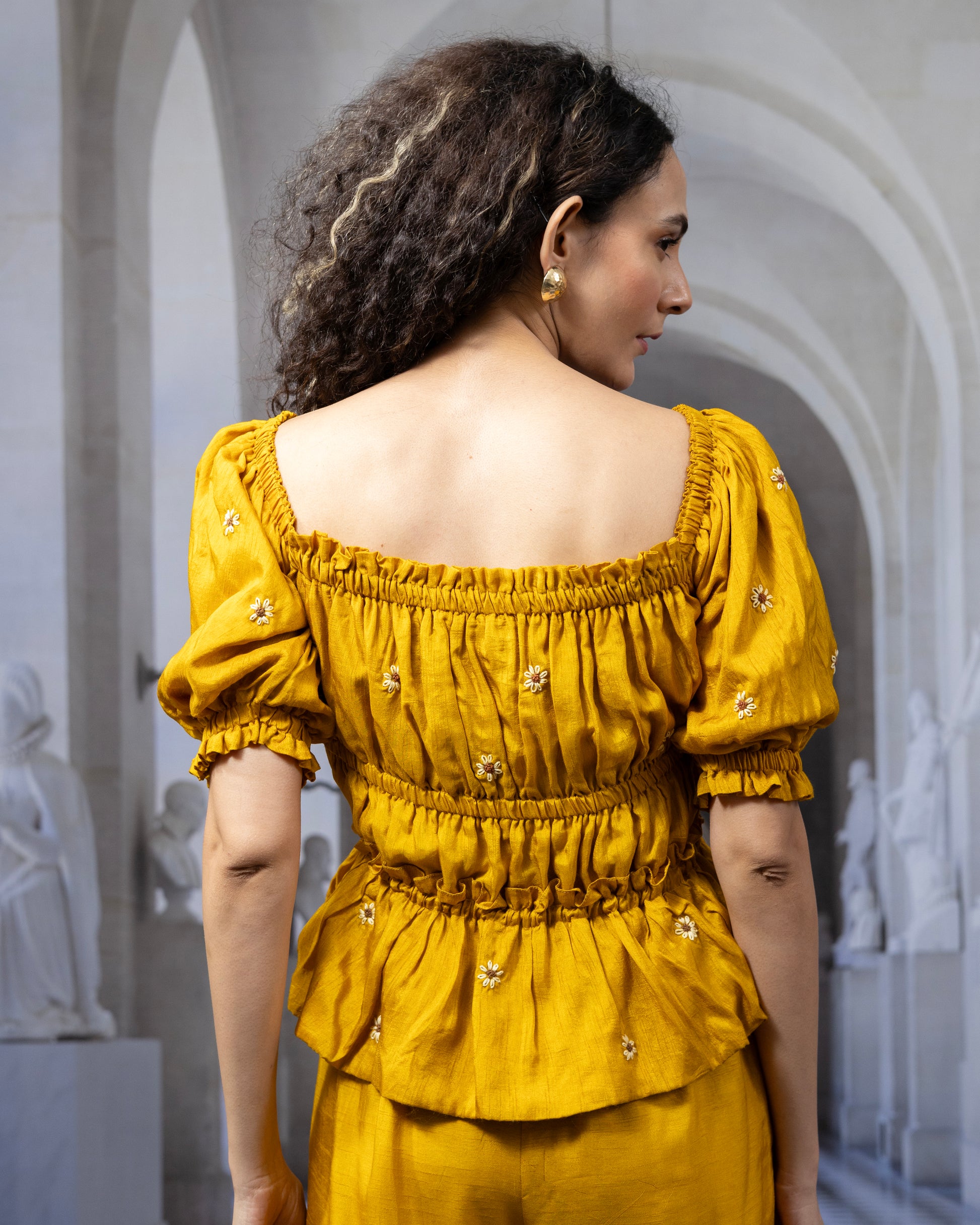 Feminine charm meets artisanal craftsmanship in the Piya Top, crafted in soft, breathable Bemberg silk — a viscose blend — and lined with 100% cotton for a comfortable, all-day wear. Featuring delicate embroidered floral butas scattered across the body and puff sleeves, this top brings a breezy elegance to any wardrobe. A gathered bodice and adjustable tie-up detail at the waist add flattering shape and a playful finish.