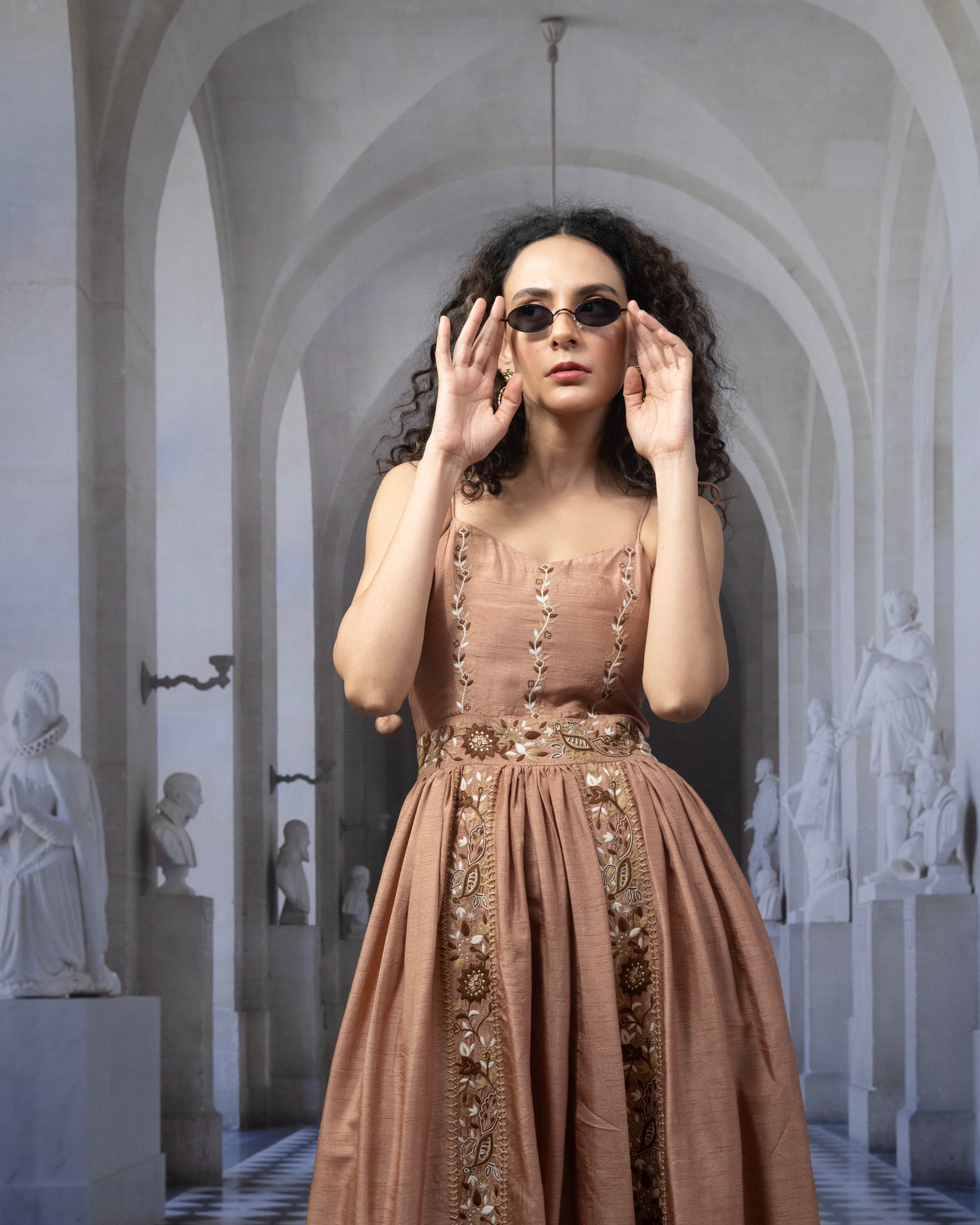 Feminine charm meets fine craftsmanship in the Poly Dress. Cut in luxurious Bemberg silk (viscose blend), this strappy midi features intricate Aari hand embroidery in rich mocha brown tones along the bodice and pleated panels. Designed with side pockets and fully lined in 100% cotton for all-day ease, it’s a breezy, artisanal piece that blends modern elegance with timeless detailing.