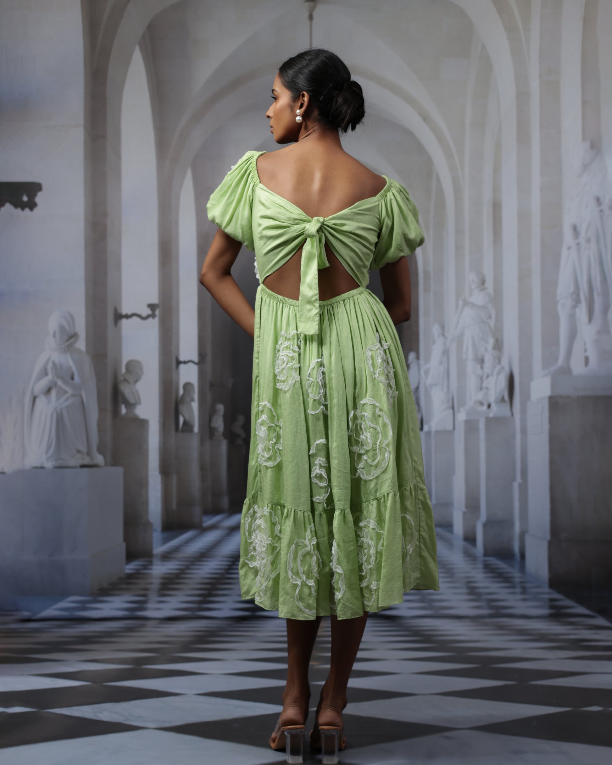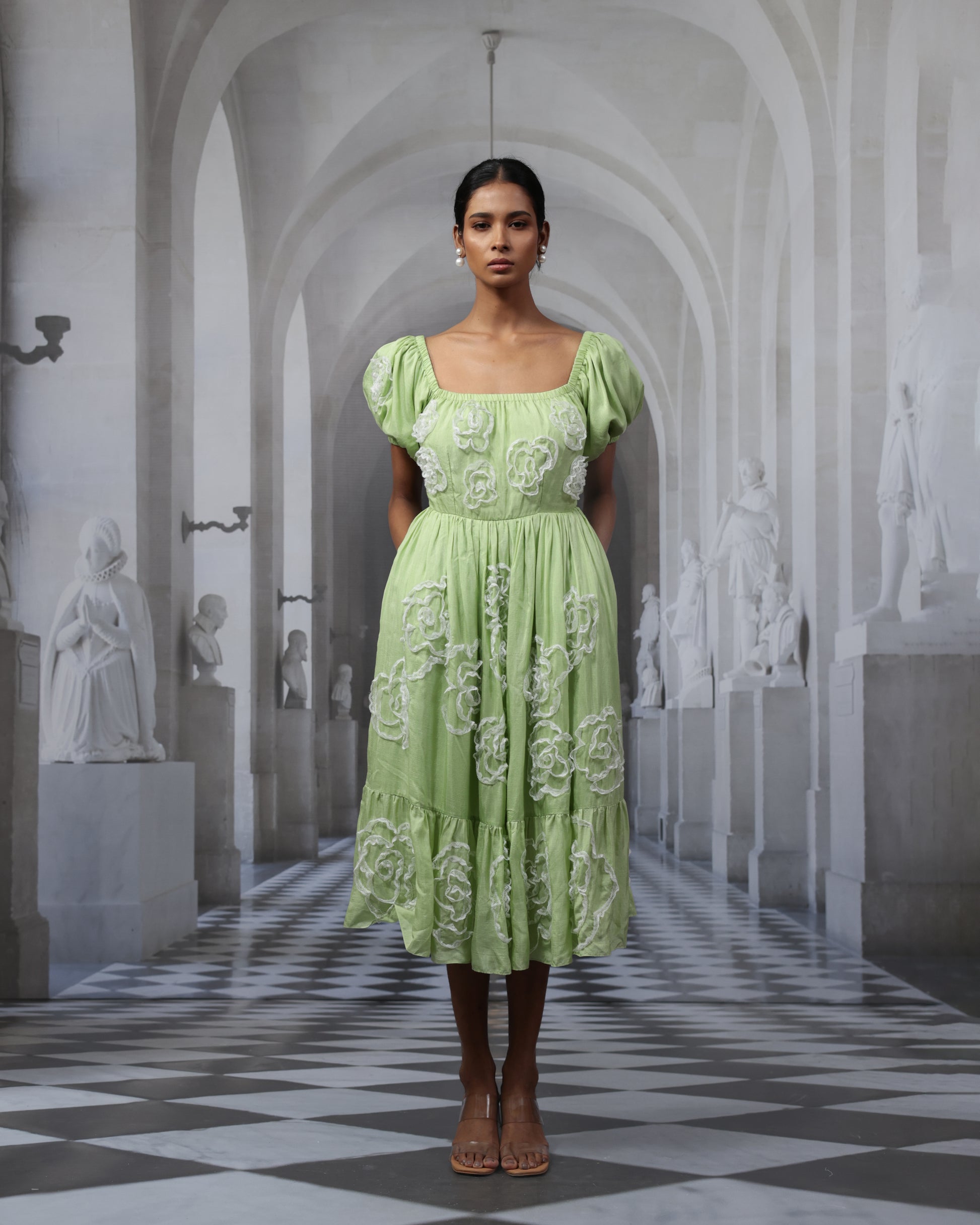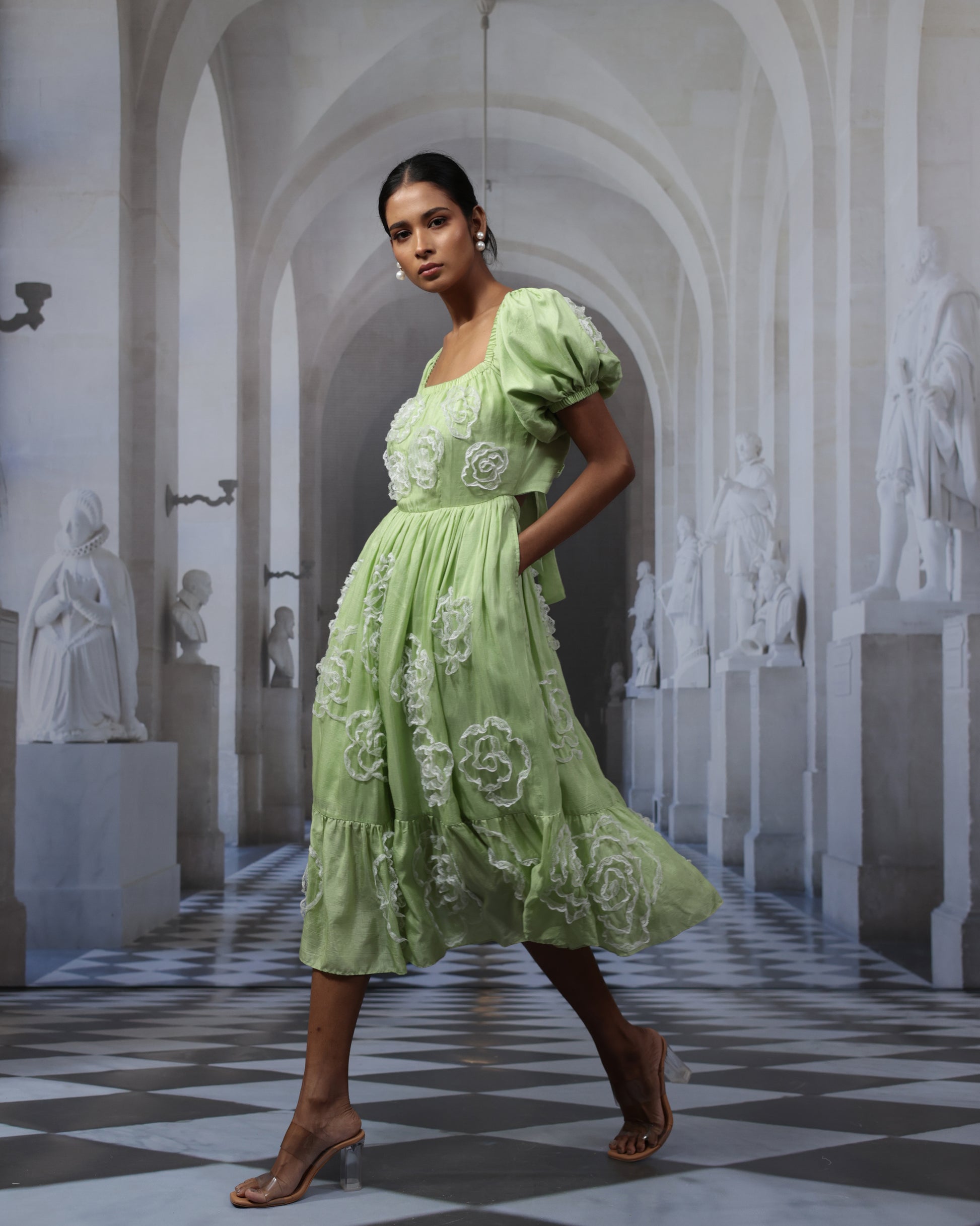 A vision in soft green, the Prajo Dress is crafted in fluid Bemberg silk — a luxe viscose-blend that drapes like a dream. Featuring romantic puff sleeves, delicate contrast lacework, and intricate hand couching embroidery, this dress is both feminine and striking.